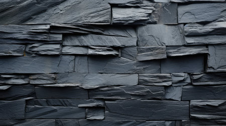 A close-up view of a wall constructed from stacked layers of dark gray and black slate stone, exhibiting a rough,...