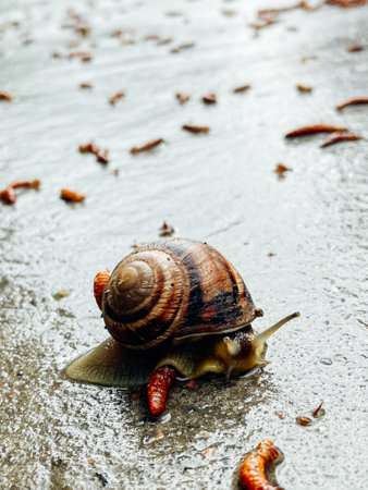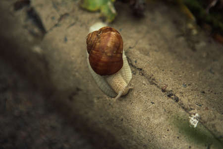 snail with shell on a gravel road