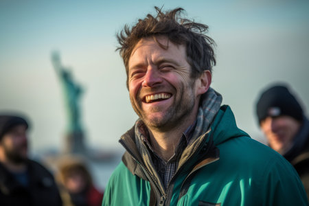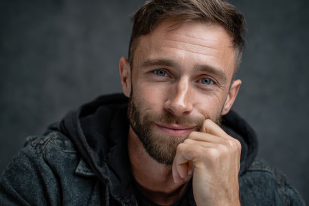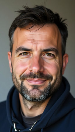 With a relaxed expression and gentle smile, this man embodies confidence and friendliness as he stands against a neutral backdrop, radiating charm and approachability.