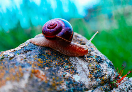 One snail on the natural background, macro view. Big beautiful helix with spiral shell.