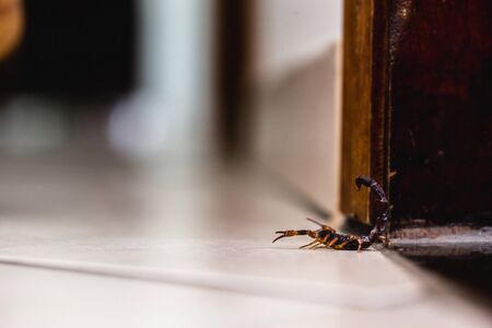 scorpion problem, scorpion plague indoors. Poisonous animal inside the house, need for fingerings. Sting danger concept.