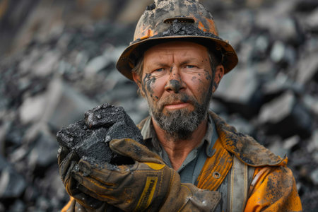 Miner in the mine holding coal