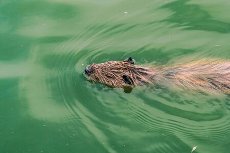 Beaver swimming in green water, close-up. The view from the top. A wild animal in its habitat.