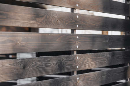 Side view of a wall of black horizontal wooden bars. The beauty of geometry. Decorative wood texture. The natural wood building material.
