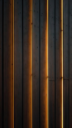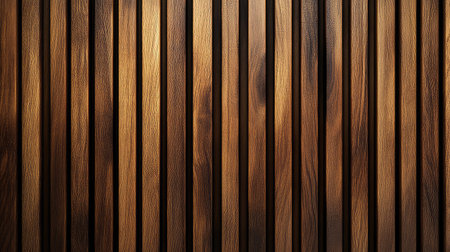 Vertical wooden planks with natural light creating streaks. The composition displays a warm color palette with shades of brown and yellow. The texture and lighting suggest an indoor environment, suitable for various design, background and commercial applications, offering copy space.