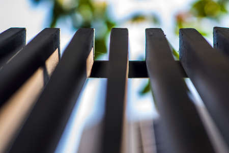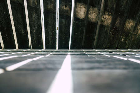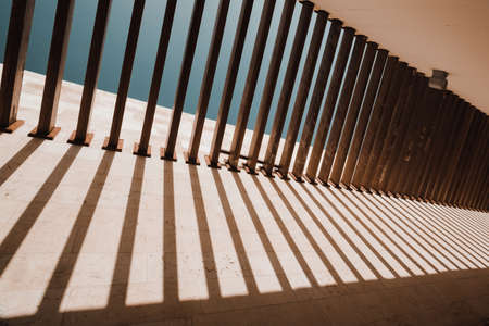 rhythmic strip of wooden slats, play of light. Cold tones, great contrast, perspective.