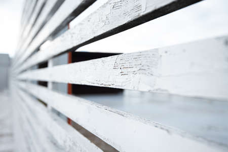 old wooden fence. cracked white paint. sharp focus in the center. blurred at the edges.