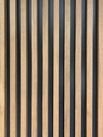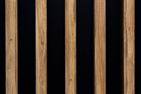 Wall decor with wooden vertical bars. A modern way of decorating walls in rooms, apartments and offices. Wall with wood paneling on black with copy space. High quality photo