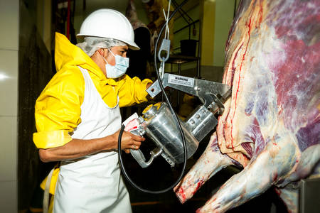 Slaughterhouse worker using a cattle carcass brisket opening saw to cut animal stern bone