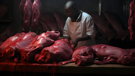 Butcher slicing fresh meat at a market stall, wearing a stained apron, showcasing skill and precision in a bustling environment with dramatic lighting.