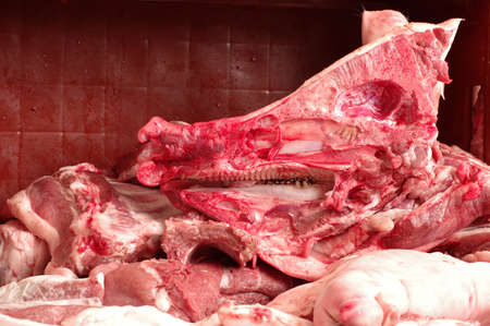 Gross lamb and cow carcass meat and bones with blood on a table of the street food vendors in the Muslim quarter of Xian town, Shaanxi Province, China