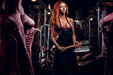 Redhead fitness woman in underwear and apron posing with ax in a refrigerated warehouse in the midst of meat carcasses