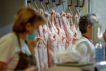 Bucharest, Romania - April 16, 2020: Lamb carcass hang from iron hooks for sale in a Romanian butcher shop before Easter.