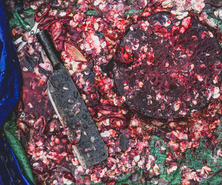 Cutting fresh red meat with a sharp, hand-held knife and tusks on a large piece of wood