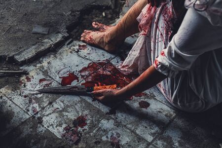 horror scence of women hold knife by hands with blood. Ghost women wear white dress stain blood at abandoned house
