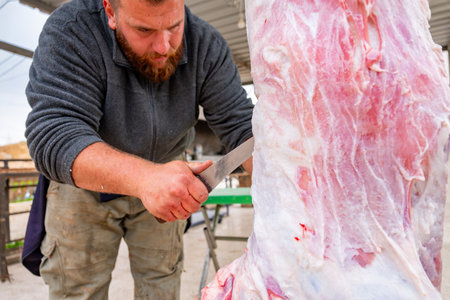 Slaughterhouse. Hands of the workers of the meat shop at work. Butcher cuts pork carcasses with a knife