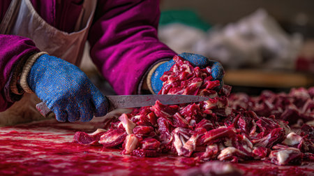 A skilled butcher skillfully cuts fresh meat on a vibrant workstation, showcasing precision and attention to detail in food preparation practices.