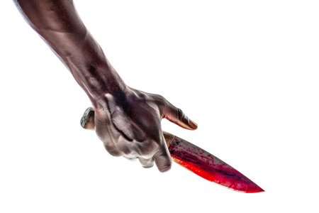 A dark-skinned hand holds a bloody knife, the blade gleaming against a stark white background.