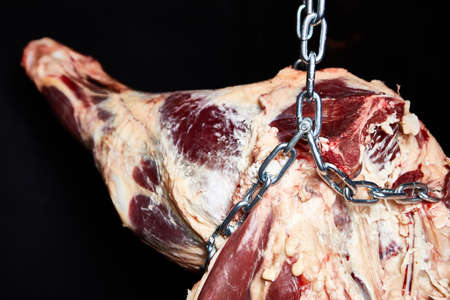 beef carcass hanging on a black background