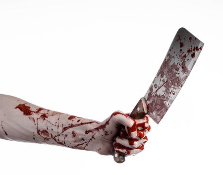 Bloody Halloween theme: bloody hand holding a large bloody kitchen knife on a white background isolated