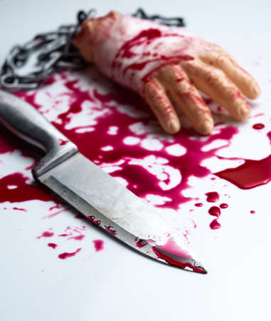 Halloween decorations,Fake Severed Hand with blood and knife,Concept Serial killer