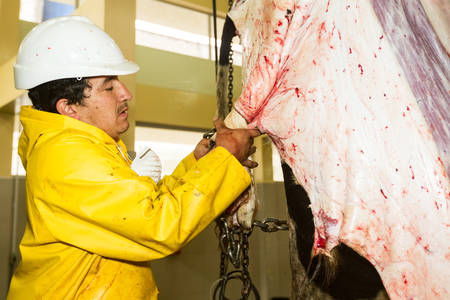 Worker in slaughterhouse wrapping cattle hide on the mechanical skinning pulleys