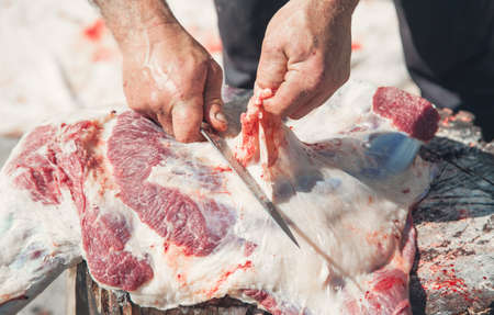 Close-up view of Indian butcher cutting goat in outdoors ,in a market place