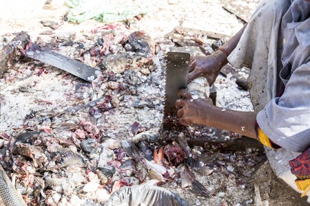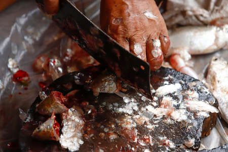 Illustrative image. Pondicherry, Tamil Nadu, India. February 26, 2014. Close up of woman hands cutting fishs on market place.