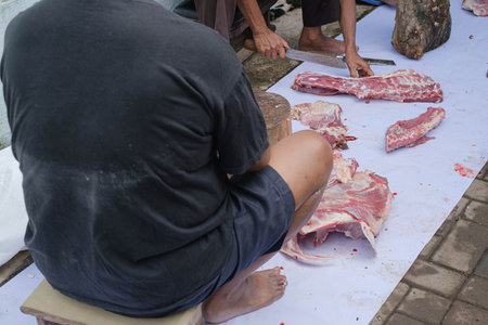 Kuala Terengganu, Malaysia - September 3, 2017: Group of Malaysian Muslims community butchering cow's meat during Eid Al-Adha Mubarak celebration, the Festival of Sacrifice to remember the story of Prophet Abraham and his son, Ismael