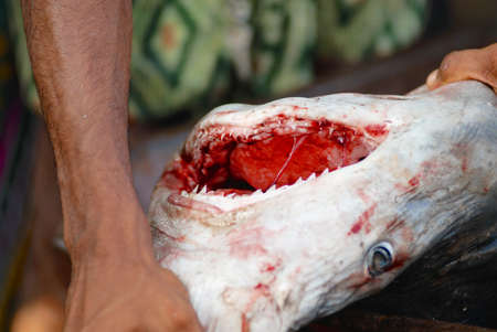 Al Hudaydah, Yemen, September 17, 2006 - Man demonstrates fresh shark at the fish market in Al Hudaydah, Yemen.