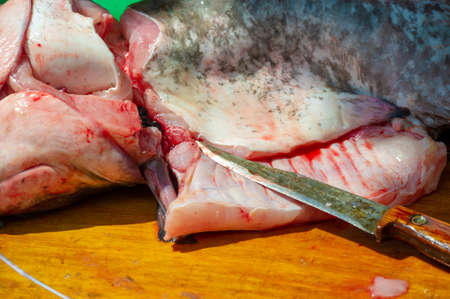 Butchering catfish for cooking, a freshwater or marine fish with barbels resembling whiskers around the mouth, typically bottom-dwelling.