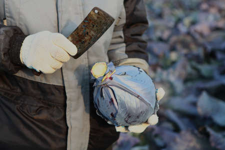 The farmer holds a head of cabbage and a hatchet in his hands. Vegetable harvesting season. Agricultural work. Vegetable crops. Red cabbage in the field. Agriculture.