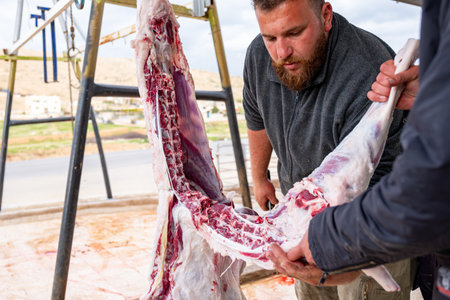 A bearded man is skillfully butchering a sheep that is hanging on a hook, carefully preparing it for consumption