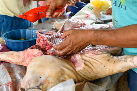 Carving raw meat. Raw meat curving on wooden background. Curving raw meat retail in a local market.