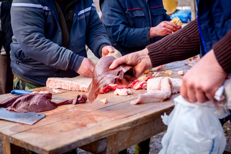 Hecha, western Ukraine - January 25, 2020: A butcher cuts pork during the traditional winter festival of butchers in the village of Hecha in western Ukraine.