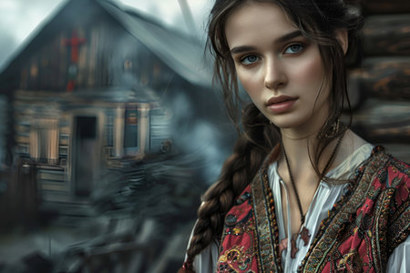 A young Slavic woman with braided hair and blue eyes, wearing traditional clothing, stands in front of a historic rustic wooden house.
