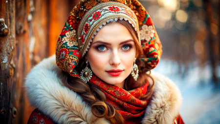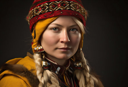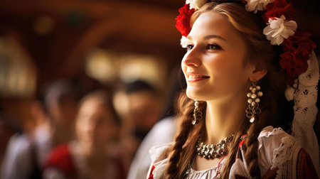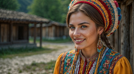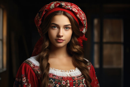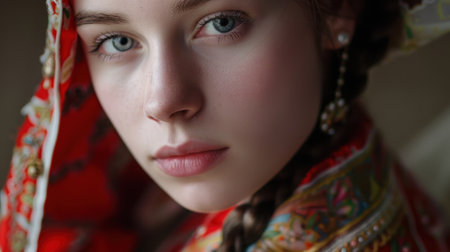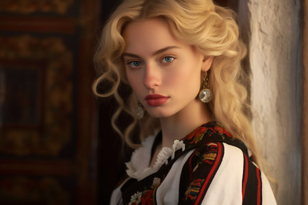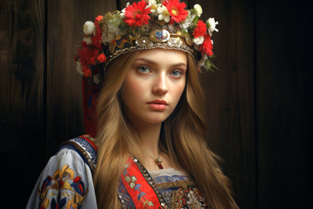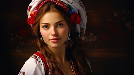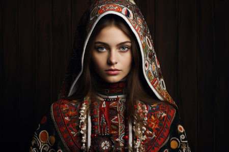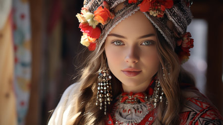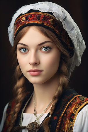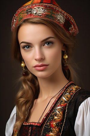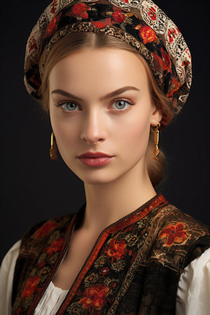Portrait of a serene young woman dressed in an ornate folk costume, symbolizing cultural heritage