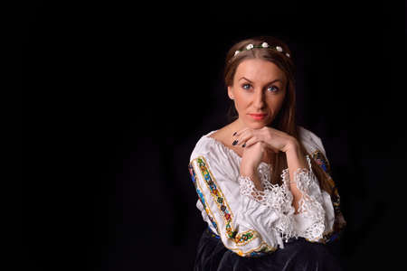 Closeup of a young Romanian woman with wreath of flowers on head dressed in traditional costume. Romanian folklore. Posing in a studio on a black background