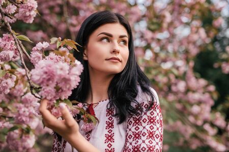 woman in ethnic costume. Ukrainian national embroidered clothes. Close-up of a beautiful adult Caucasian woman in traditional authentic Ukrainian clothes. Ukrainian handmade vyshyvanka.