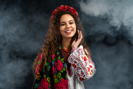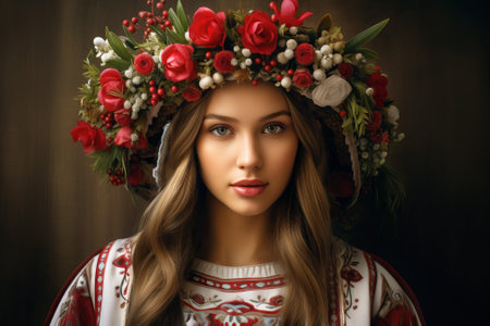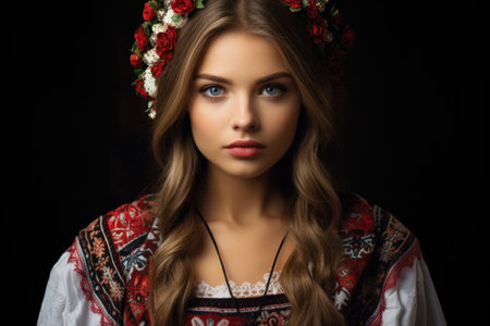 Ukrainian girl adorned with floral wreath. Young lady in traditional Ukrainian attire. Concept of cultural heritage, national costume, folk traditions. Dark background.