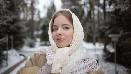 Portrait of unknown beautiful young woman girl with headscarf on her shoulders and pot in her hands at Celebration of Maslenitsa Shrovetide holiday in Gomel, Belarus