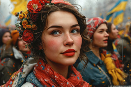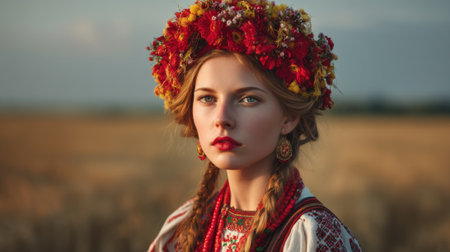 Closeup of beautiful young Ukrainian woman in floral crown looking at camera : Generative AI