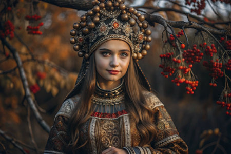 A beautiful girl in a traditional Russian national costume. Against the background of rowan trees. The portrait symbolizes the traditions and beauty of the Russian people.