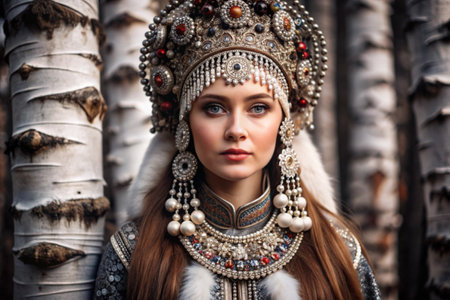A beautiful girl in a traditional Russian national costume. Against the background of a birch grove. The portrait symbolizes the traditions and beauty of the Russian people.