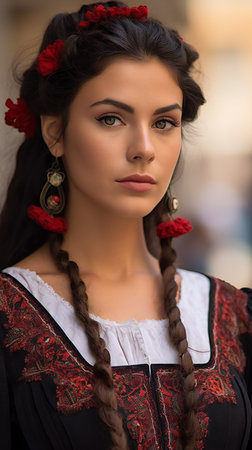 A captivating portrait of a young woman adorned in a vibrant traditional folk costume, showcasing cultural heritage and artistic craftsmanship amidst a charming urban backdrop.