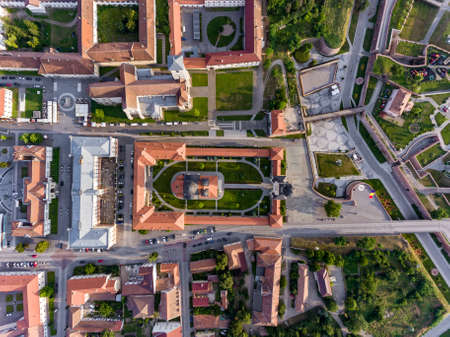 Aerial view of the town center with hills, buildings, streets, vegetation and surroundings in Rupea, Romania, 2021