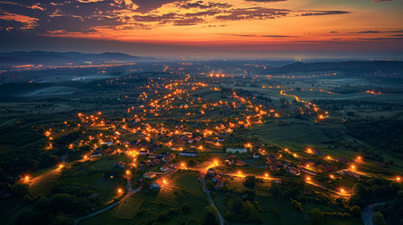 Town at sunset cityscape with street lights aerial view top down illuminated.