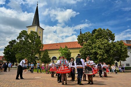 Brno - Bystrc, Czech Republic, June 22, 2019. Traditional Czech feast. Folk Festival. Girls and boys dancing in beautiful costumes. An old Christian holiday, a day of abundance, joy and prosperity.