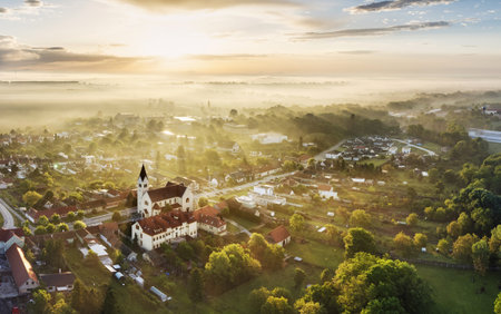 Drone photo of foggy sunrise over village - golden sun light with beams and shadows.