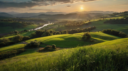 Beautiful sunset in the mountains. Landscape with green meadows and forest.